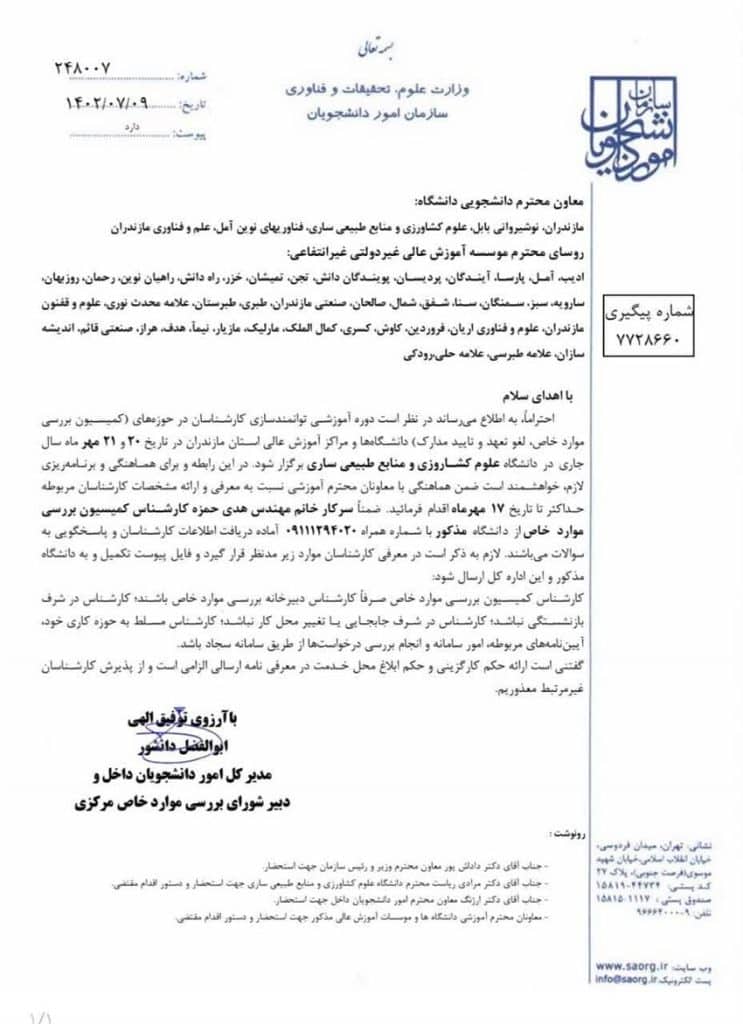 با هماهنگی سازمان امور دانشجویان نشست تخصصی کارشناسان کمیسیون موارد خاص و کارشناسان لغو تعهد آموزش رایگان دانشگاه های دولتی و غیرانتفاعی استان به میزبانی دانشگاه علوم کشاورزی و منابع طبیعی ساری در روز های پنج شنبه و جمعه (20 الی 21 مهر) برگزار می گردد.